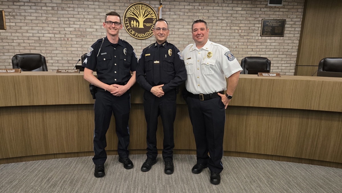 The Farmington Public Safety Department celebrated two promotions at the June 16 City Council Meeting. Sergeant Jimmy Wren was promoted to Commander, and Public Safety Officer Ryan Baessler was promoted to Sergeant. Well-deserved recognition.