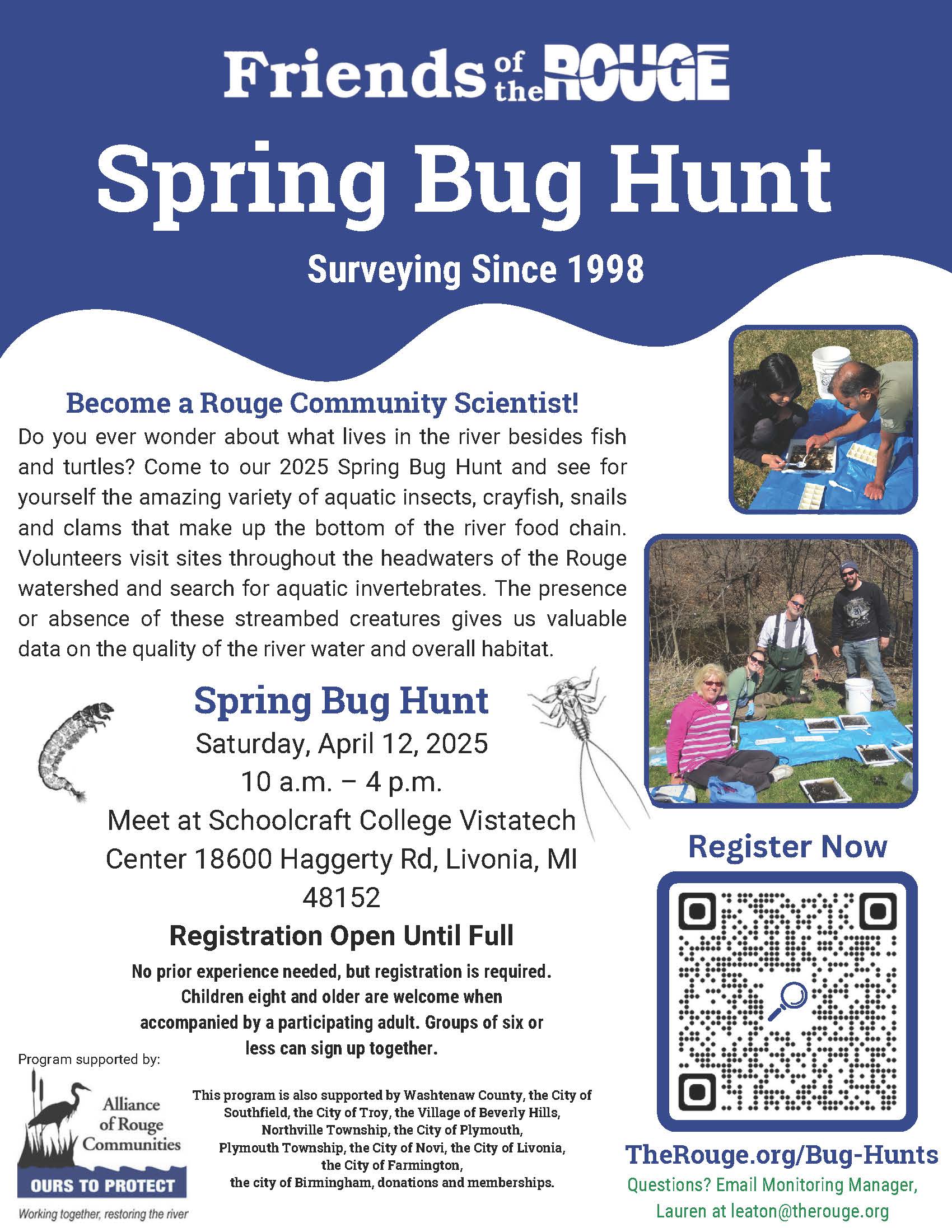 The Friends of the Rouge will be hosting its Spring Bug Hunt on Saturday, April 12 from 10:00 a.m. to 4:00 p.m. - meeting at the Schoolcraft College Vistatech Center located at 18600 Haggerty Road in Livonia.